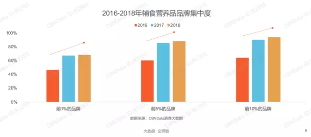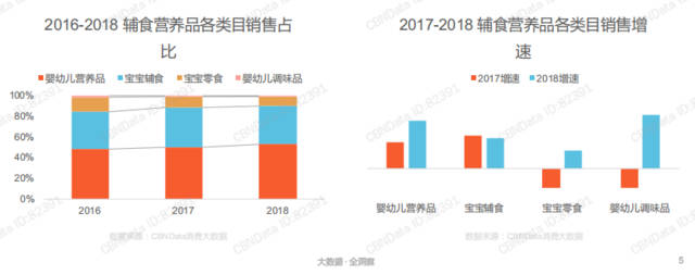 目前輔食營養(yǎng)品大致分為嬰幼兒營養(yǎng)品、寶寶輔食、寶寶零食、嬰幼兒調(diào)味品四個子品類。從上圖我們不難看出,從2016年—2018年嬰幼兒營養(yǎng)品從不足50%提升至50%以上,銷售占比逐年提升,發(fā)展態(tài)勢一片大好。一方面,“生命早期1000天營養(yǎng)健康”在政府層面的確立,更是為嬰兒營養(yǎng)品打開了市場的大門;另一方面,在優(yōu)生優(yōu)育觀念的影響下,孕育下一代成為每個家庭的頭等大事,嬰幼兒營養(yǎng)品的市場占比與熱度日益提升。